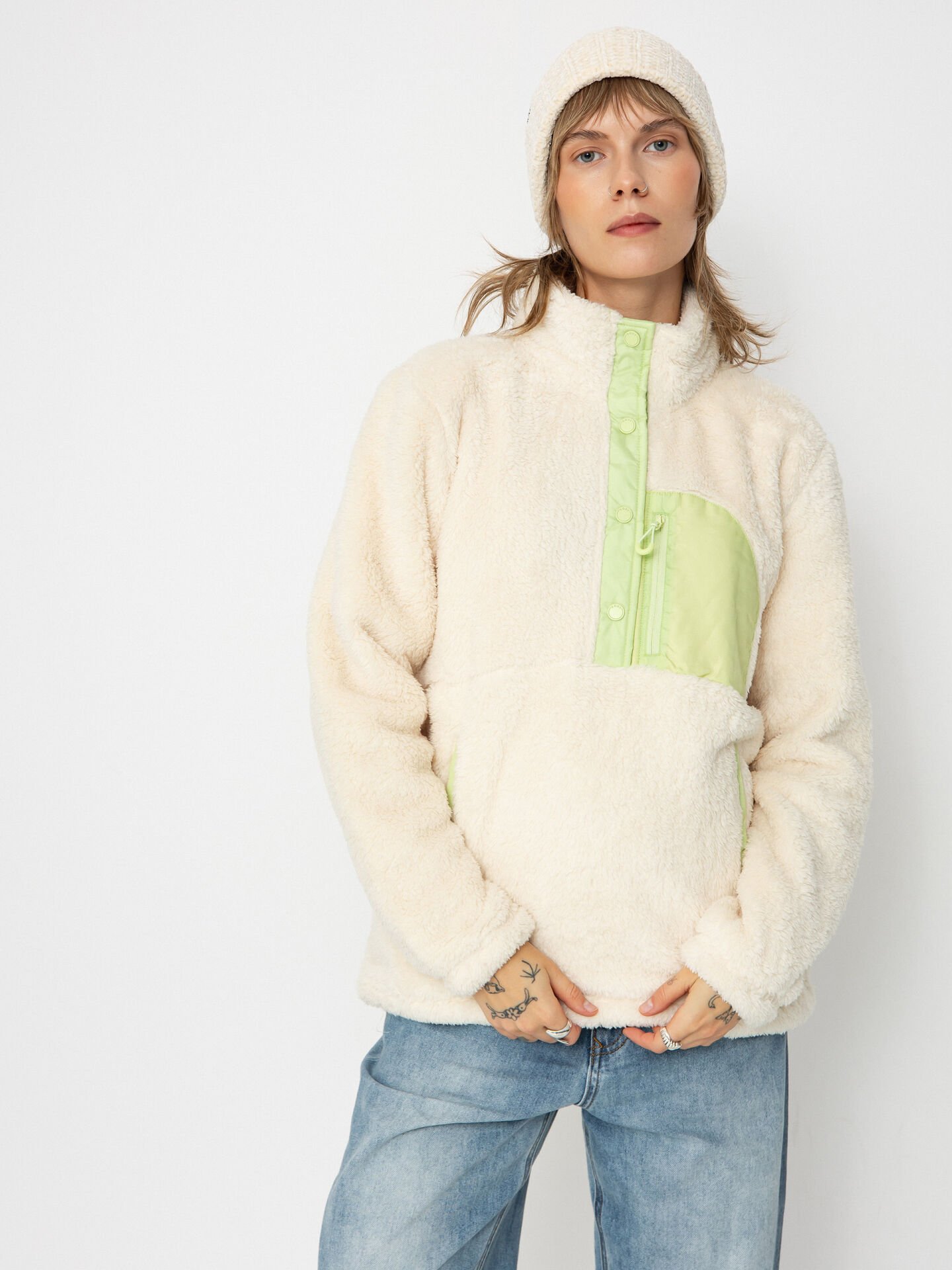 Soğuk havalar geldiğinde tarzınızdan ödün vermeden sıcak kalmak ister misiniz? %100 geri dönüştürülmüş polyesterden üretilmiş sherpa kumaşı ile bu polar ceket, doğaya saygılı olmanın yanı sıra sizi sıcacık tutar.