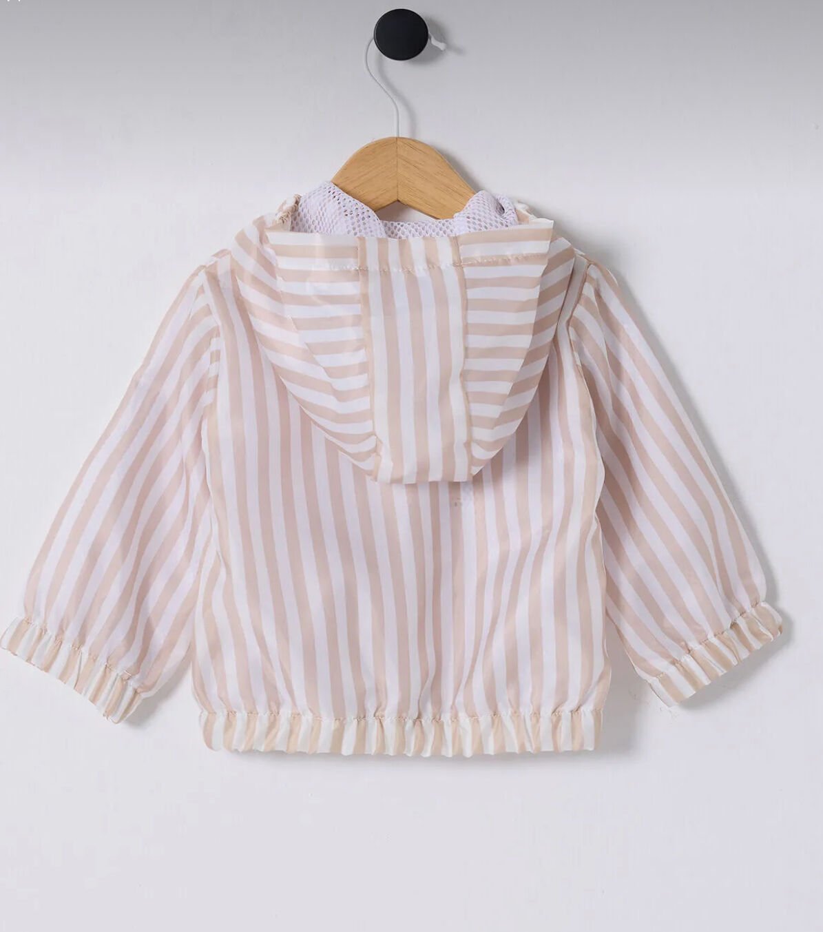 Bej renkte, şık çizgili tasarımıyla dikkat çeken bu erkek çocuk yağmurluğu, hafif dokuma polyamid kumaşı ve su geçirmez yapısıyla yağmurlu havalarda minikleri kuru tutar. Uzun kollu ve kapüşonlu yapısı sayesinde rüzgara karşı da etkili koruma sağlar.